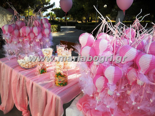 ΔΙΑΚΟΣΜΗΣΗ ΒΑΠΤΙΣΗΣ ΣΤΟΝ ΑΓΙΟ ΝΙΚΟΛΑΟ ΣΤΗ ΛΟΥΤΣΑ, ΘΕΜΑ ΤΟ ΑΕΡΟΣΤΑΤΟ, ΣΤΕΦΑΝΙΑ ΜΕ ΠΕΤΑΛΟΥΔΕΣ, ΑΕΡΟΣΤΑΤΑ, ΤΡΑΠΕΖΙ ΕΥΧΩΝ ΜΕ ΚΟΥΦΕΤΑ ΠΟΛΥΧΡΩΜΑ, ΓΛΥΚΑΚΙΑ ΒΑΠΤΙΣΗΣ, ΓΥΑΛΕΣ ΜΕ ΜΠΕΖΕΔΕΣ