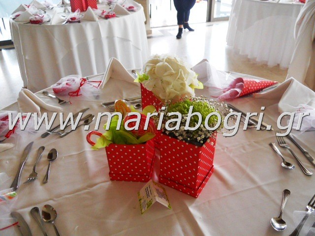 | Διακόσμηση τραπεζιού σε πουά κόκκινο και ασσορτί μπομπονιέρες |