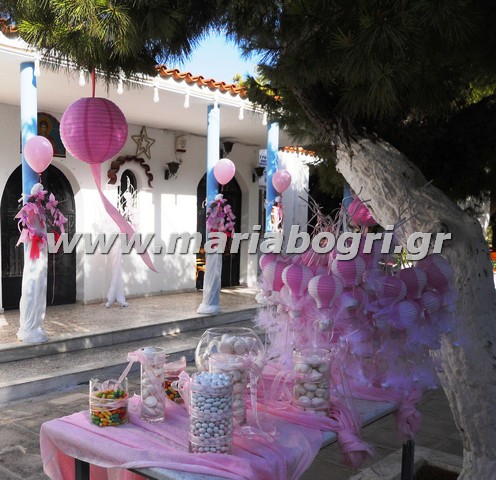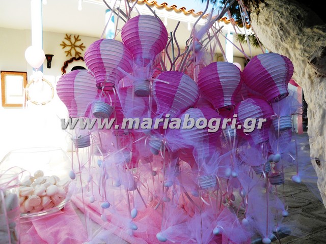 ΔΙΑΚΟΣΜΗΣΗ ΒΑΠΤΙΣΗΣ ΣΤΟΝ ΑΓΙΟ ΝΙΚΟΛΑΟ ΣΤΗ ΛΟΥΤΣΑ, ΘΕΜΑ ΤΟ ΑΕΡΟΣΤΑΤΟ, ΣΤΕΦΑΝΙΑ ΜΕ ΠΕΤΑΛΟΥΔΕΣ, ΑΕΡΟΣΤΑΤΑ, ΤΡΑΠΕΖΙ ΕΥΧΩΝ ΜΕ ΚΟΥΦΕΤΑ ΠΟΛΥΧΡΩΜΑ, ΓΛΥΚΑΚΙΑ ΒΑΠΤΙΣΗΣ, ΓΥΑΛΕΣ ΜΕ ΜΠΕΖΕΔΕΣ