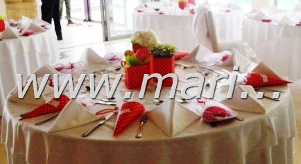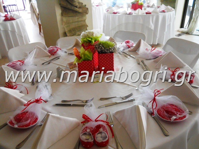 | Διακόσμηση τραπεζιού σε πουά κόκκινο και ασσορτί μπομπονιέρες |
